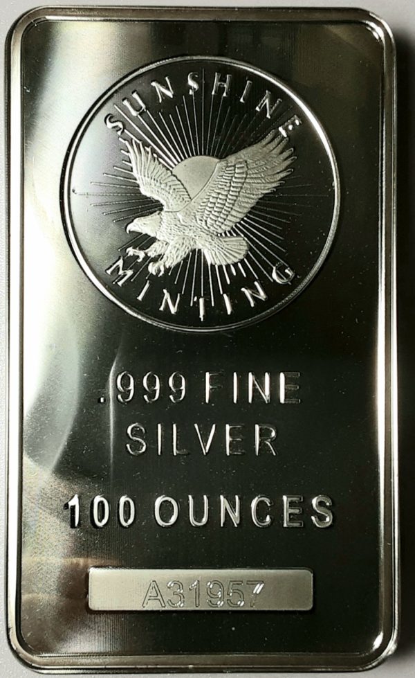 These 100 oz troy silver bars are in brand new condition and ship encased in their original cardboard box from Sunshine. Produced by the renowned Sunshine Mint of Idaho, every 100 oz Sunshine Silver Bar features the world-famous design that is among the most popular with collectors and investors alike. The design features the well-known Silver Eagle along with the name of the mint. Also stamped on each bar is the name of the mint itself and the 100 oz troy weight.